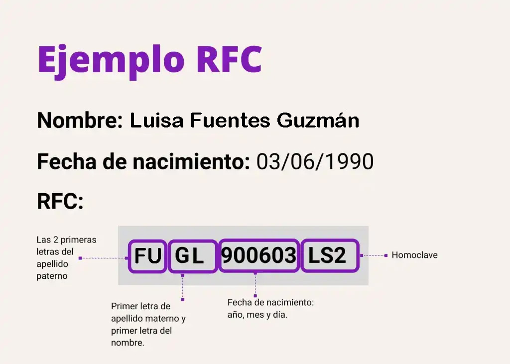 Para que quede veamos este ejemplo. Imaginemos que te llamas Luisa Fuentes Guzmán y naciste el 3 de junio de 1990. Por ello, tu RFC sería FUGL900603LS2 (recuerda que los últimos tres dígitos son la homoclave que te da el SAT).